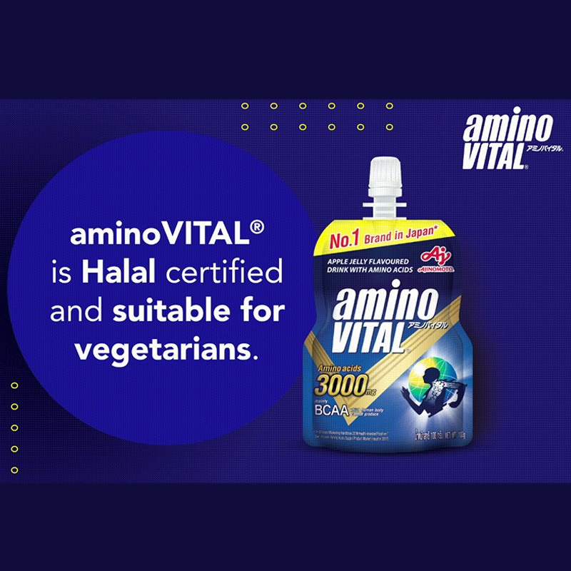 aminoVITAL® is the Number 1 Brand in Japan*. It is the only jelly drink with amino acids in Malaysia. aminoVITAL® contains 3,000 mg of amino acids, mainly Branched Chain Amino Acids (BCAAs), it also provides energy at 112 Kcal per pouch which is suitable for endurance sports players such as runners, cyclists, triathlon contestants, swimmers, golfers, and hikers.