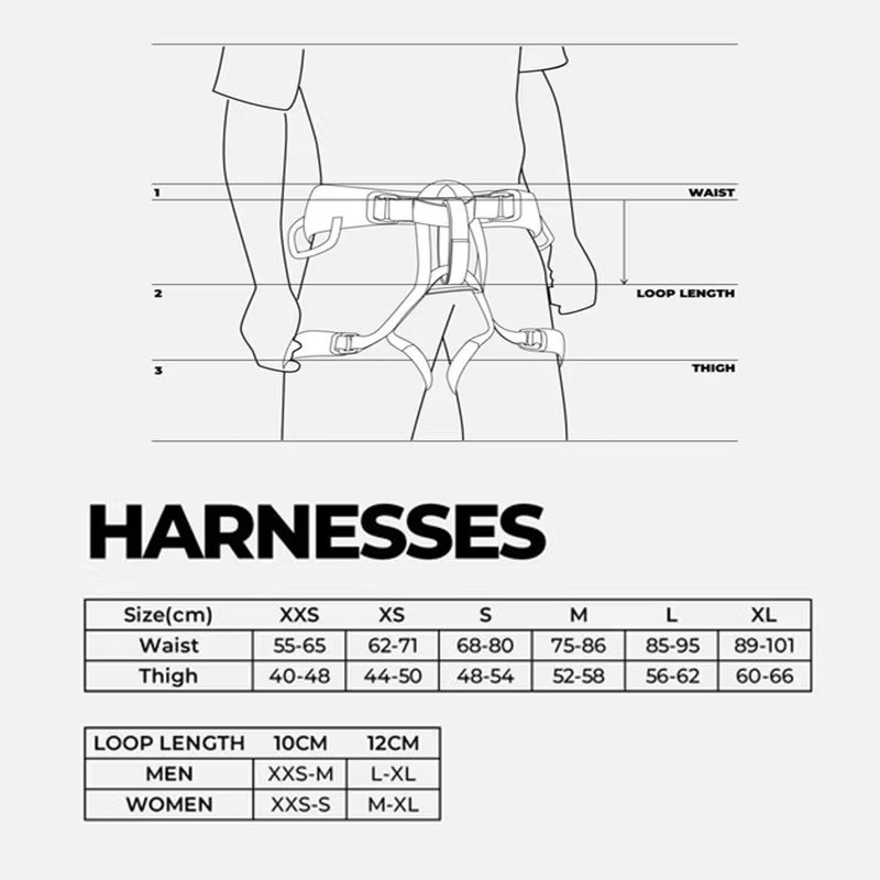 All-terrain, lightweight and adjustable harness for rock climbing, technical alpine climbing and ice climbing.