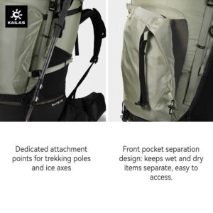 – Dedicated attachment points for trekking poles and ice axes.