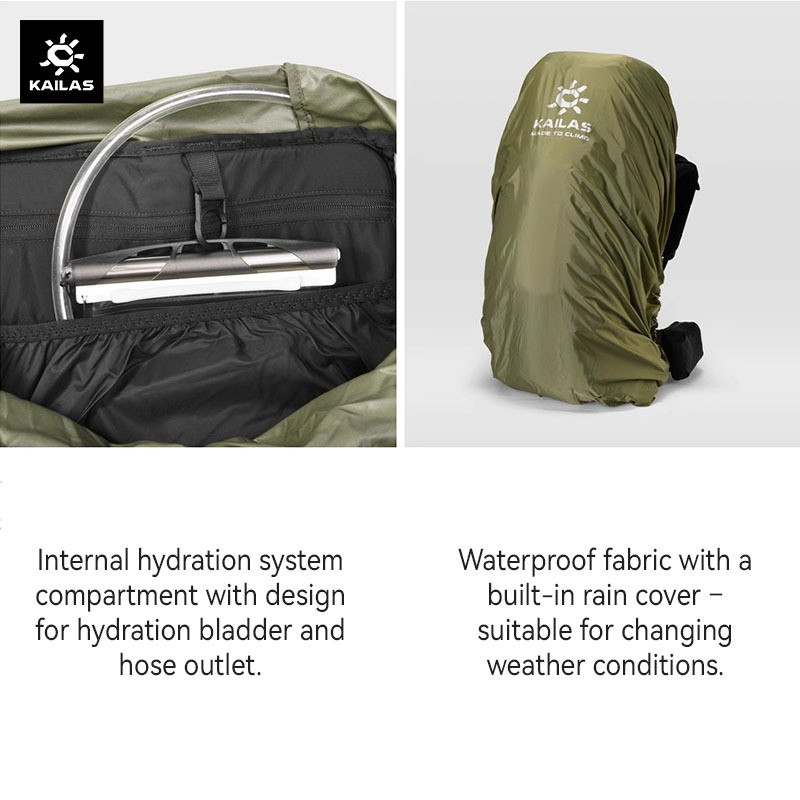 – Internal hydration system compartment with design for hydration bladder and hose outlet.