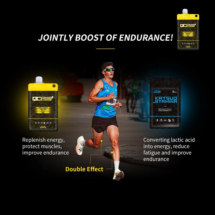 Used with Katsuo Stamina, it creates a Double Effect for energy replenishment, muscle protection, and improved endurance. This caffeine-free, coffee-flavored supplement can boost performance by up to 20%.